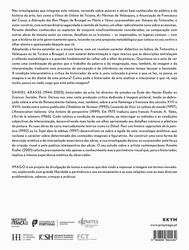 Nas investigações que integram este volume, versando sobre autores e obras bem conhecidas do público e da história da arte, tais como a Vénus de Urbino de Ticiano, As Meninas de Velásquez, a Anunciação de Francesco del Cossa, a Adoração dos Reis Magos de Bruegel ou Marte e Vénus surpreendidos por Vulcano de Tintoretto, o autor constrói, com extraordinária sagacidade e sentido de humor, um olhar radicalmente novo sobre as mesmas. Perante detalhes conhecidos ou aspectos de conjunto insuficientemente considerados, na comparação com outras obras do mesmo autor ou coevas, desafiam-se os truísmos – os impensados, os lugares comuns – com que a história da arte genericamente opera, tecendo-se uma proposta metodológica que coloca no seu centro o olhar atento e apaixonado daquele que vê.