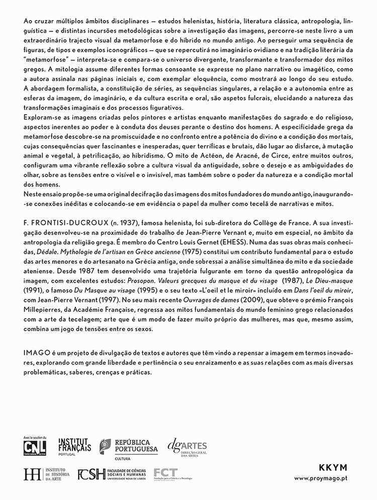 Ao cruzar múltiplos âmbitos disciplinares – história, literatura, antropologia, linguística – e distintas incursões metodológicas sobre a investigação das imagens, percorre-se neste livro a um extraordinário trajecto visual da metamorfose e do híbrido no mundo antigo. Ao perseguir uma sequência de figuras, de tipos e exemplos iconográficos – que se repercutirá no imaginário ovidiano e na tradição literária da “metamorfose” – interpreta-se e compara-se o universo divergente, transformante e transformador dos mitos gregos. A mitologia assume diferentes formas consoante se expresse no plano narrativo ou imagético, como a autora assinala nas páginas iniciais e, com exemplar eloquência, como mostrará ao longo do seu estudo. A abordagem formalista, a constituição de séries, as sequências singulares, a relação e a autonomia entre as esferas da imagem, do imaginário, e da cultura escrita e oral, são aspetos fulcrais, elucidando a natureza das transformações imaginais e dos processos figurativos.